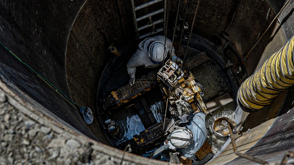 まず、立坑を覆っていた覆工板を撤去し、転落防止柵を設置します。